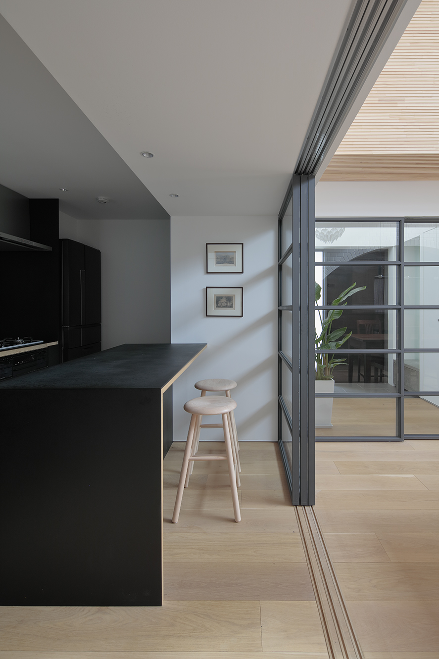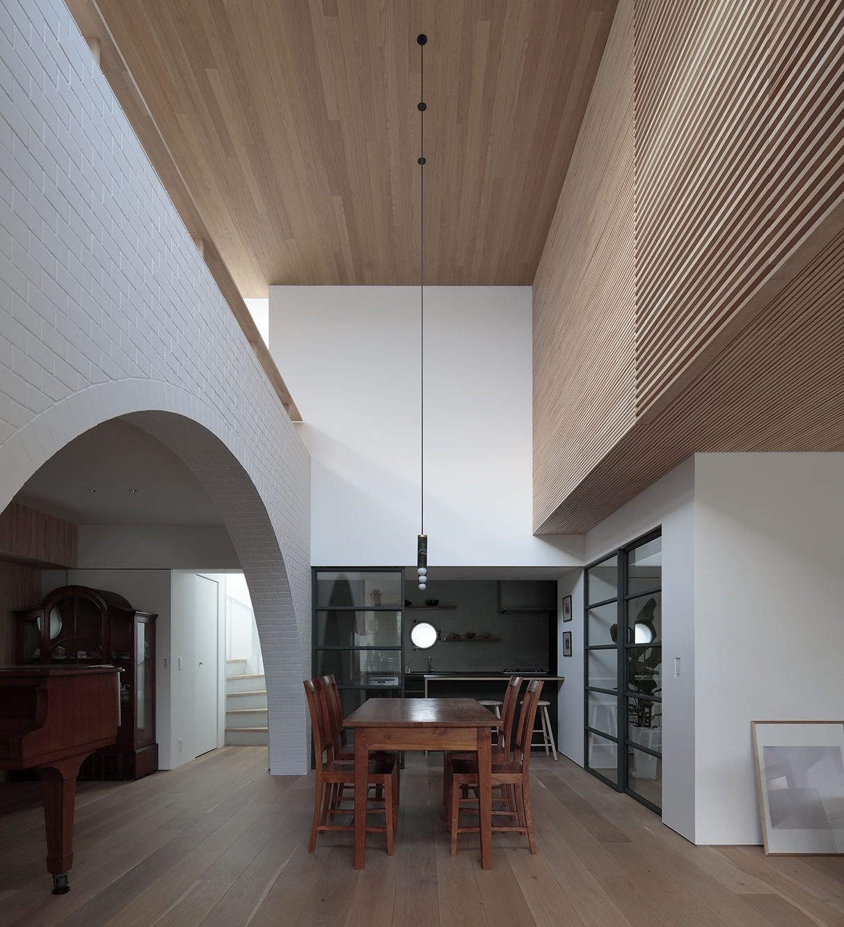 RC躯体は構造補強、中性化抑止工法を行い耐久性を向上。 既存の 特徴的なアーチ壁や船舶窓を残し、ダイナミックな構造体を活かしながら主には面によって幅の違う白木、スチール製格子窓、その他モノトーン材料で構成。